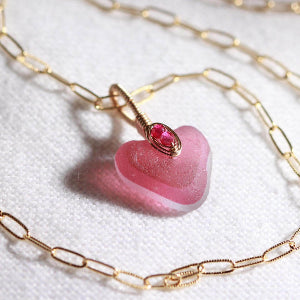 Bright Pink English Multi sea glass, Ruby and chain in 14kt GF