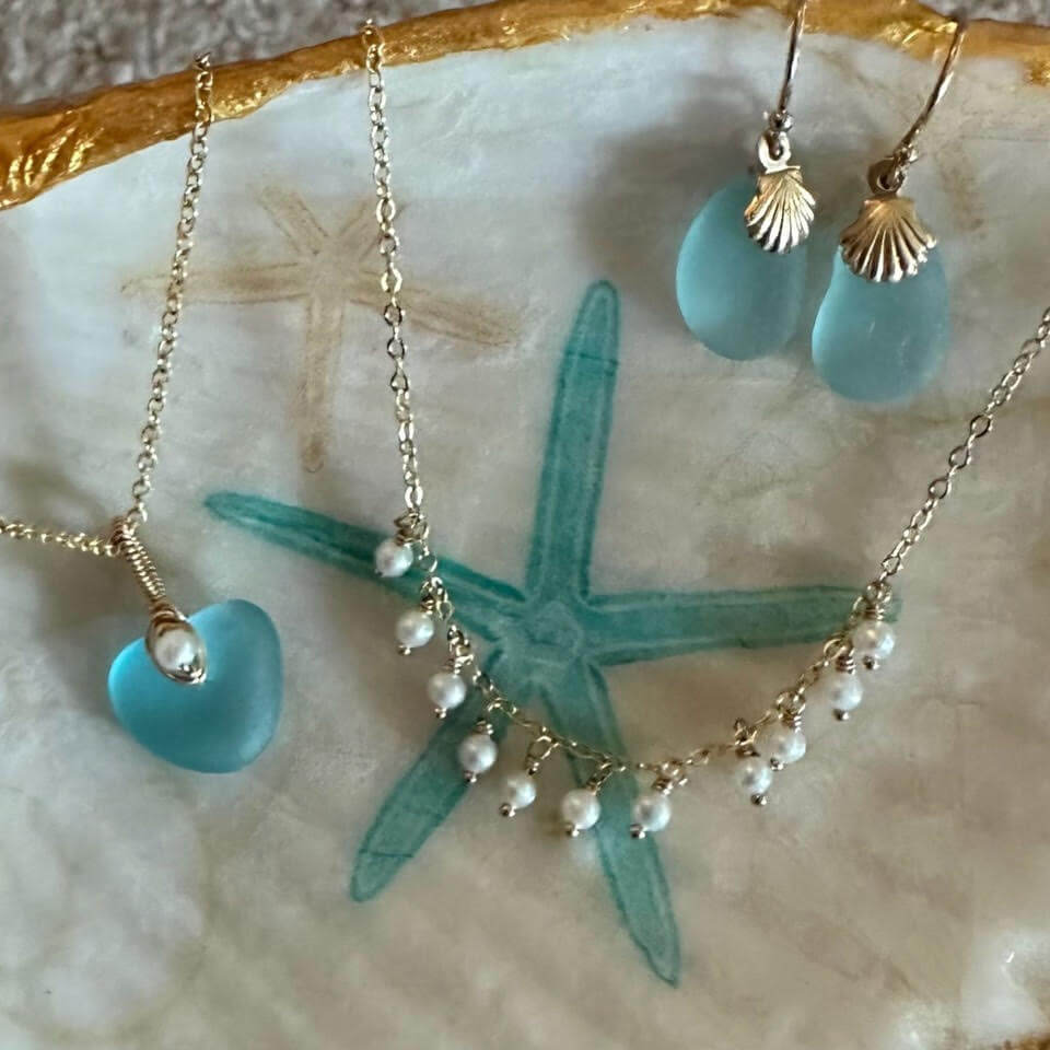 I offer beautiful and elegant unique artisan crafted sea glass, gemstone and pearl jewelry. Each of my rare genuine sea glass and beach glass necklaces and earrings are hand-crafted. I pour through my sea glass from the North Sea of England for hours finding the perfect pieces. I then match beautiful gemstones and freshwater pearls in the perfect hue and shape to compliment these amazing beach glass (beachglass) and sea glass (seaglass) pieces. I offer sea glass jewelry in all of the colors of the rainbow, so you are sure to find something you adore. From fun and sassy to elegant and stunning. I have a sea glass jewelry piece that will fit every occasion including beach wedding jewelry for brides and bridesmaids as well as gifts for moms, birthdays, anniversaries or just a special gift for yourself someone you love.